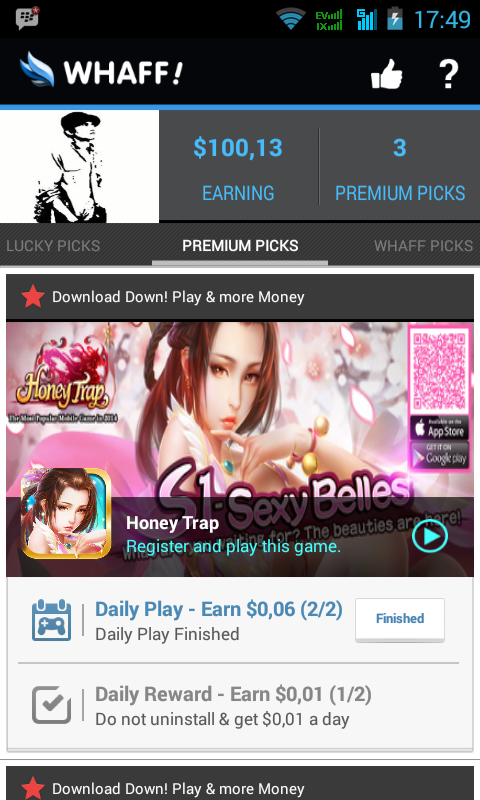 Kemudian instal apk yang tersedia di bagian Premium Picks dan setelah selesai instal apk sobat akan langsung mendapatkan dollar. Ini dollar saya dari Whaff